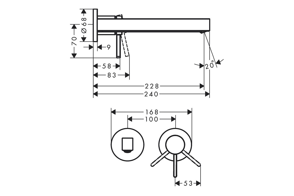 • состоит из: однорычажный смеситель для раковины скрытого монтажа, настенное крепление, сливной клапан