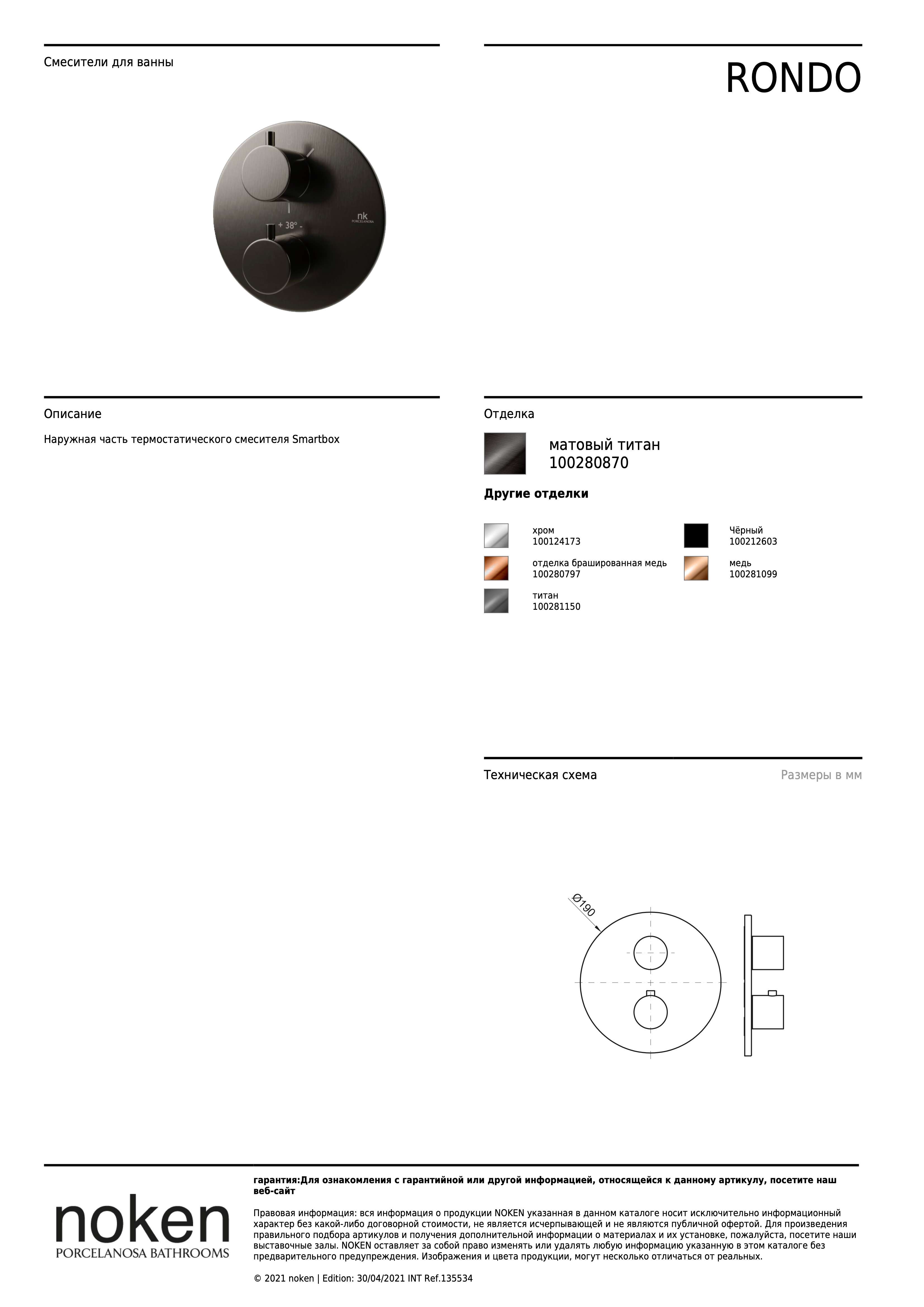 RONDO 100280870 ВНЕШНЯЯ ЧАСТЬ ТЕРМОСТАТА, БРАШ. ТИТАН