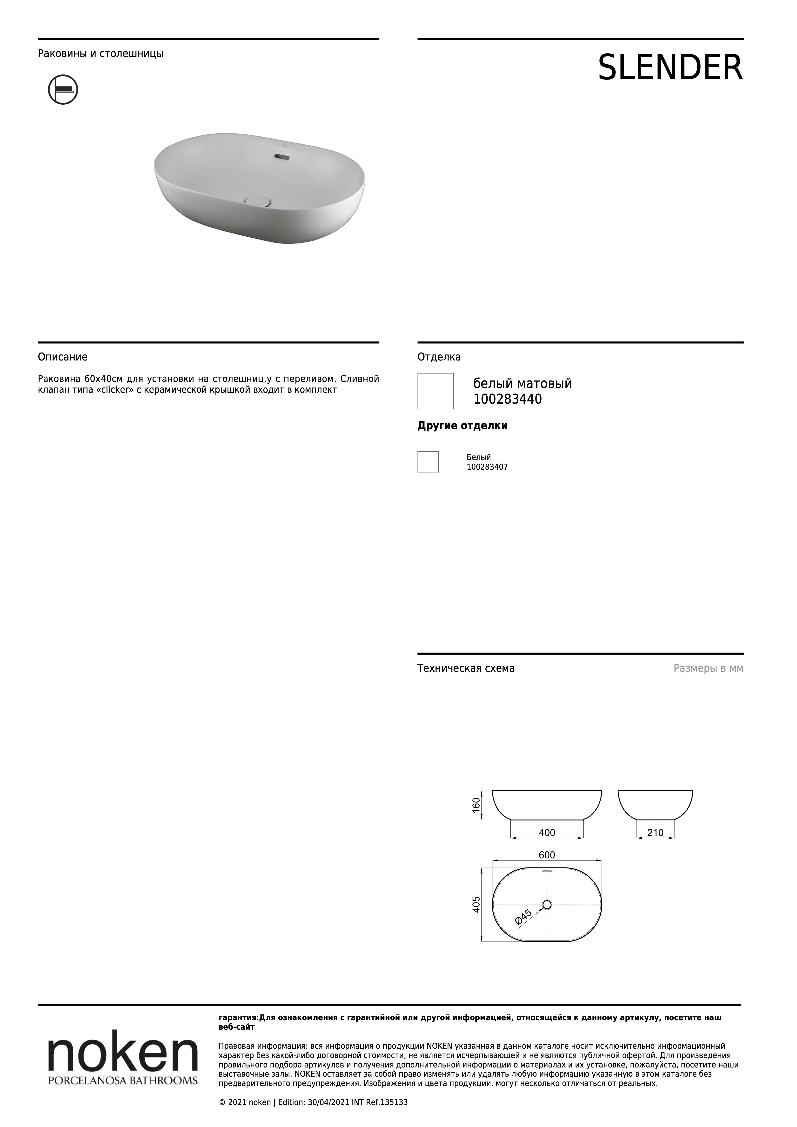 SLENDER 100283440 РАКОВИНА НА СТОЛЕШНИЦУ 40x60СМ С ПЕРЕЛИВОМ И ДОННЫМ КЛАПАНОМ, МАТ. БЕЛАЯ