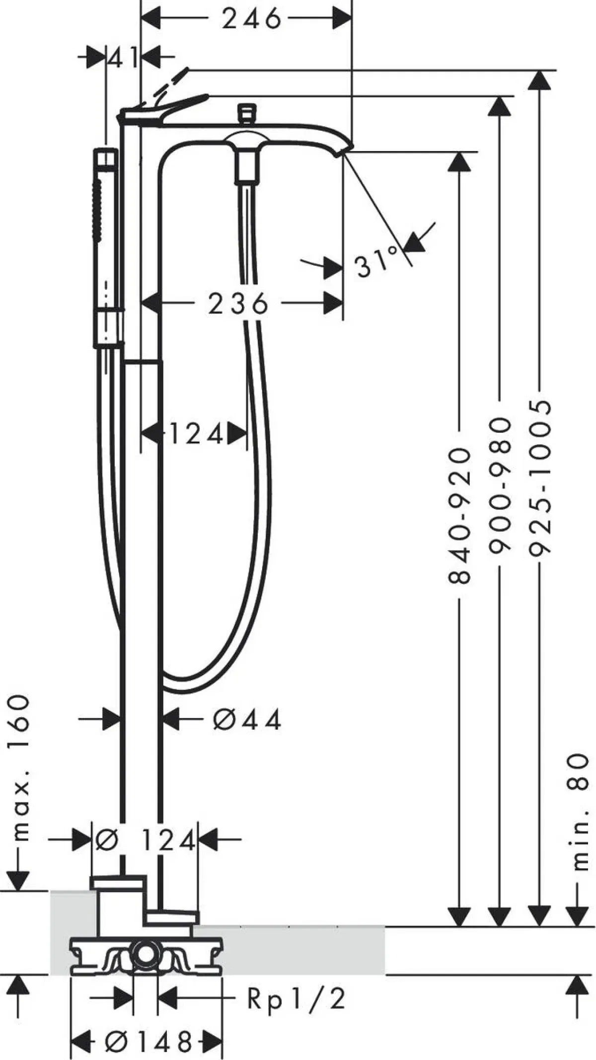 • состоит из: однорычажный смеситель для ванны напольный, ручной душ-«палочка», шланг для душа, держатель для душа